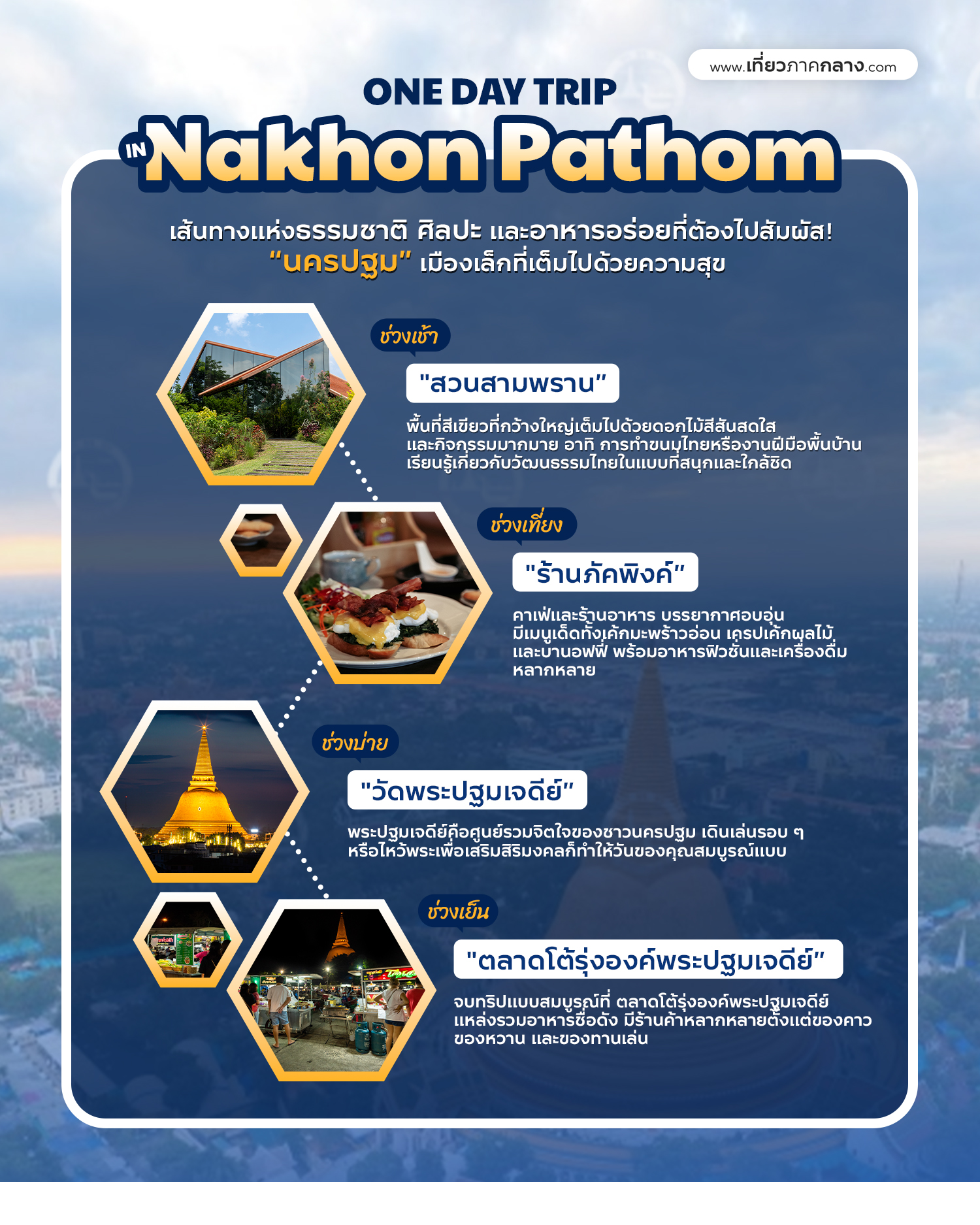 เพียงแค่หนึ่งชั่วโมงจากกรุงเทพฯ คุณก็จะได้พบกับ “นครปฐม” เมืองเล็ก ๆ ที่ซ่อนตัวอยู่ในบรรยากาศที่แสนอบอุ่น โดดเด่นด้วยธรรมชาติอันงดงาม ศิลปวัฒนธรรมที่หลากหลาย และอาหารท้องถิ่นรสเลิศ เหมาะสำหรับการพักผ่อนแบบวันเดียว แต่กลับเติมเต็มทุกอารมณ์ความสุขที่คุณตามหา!