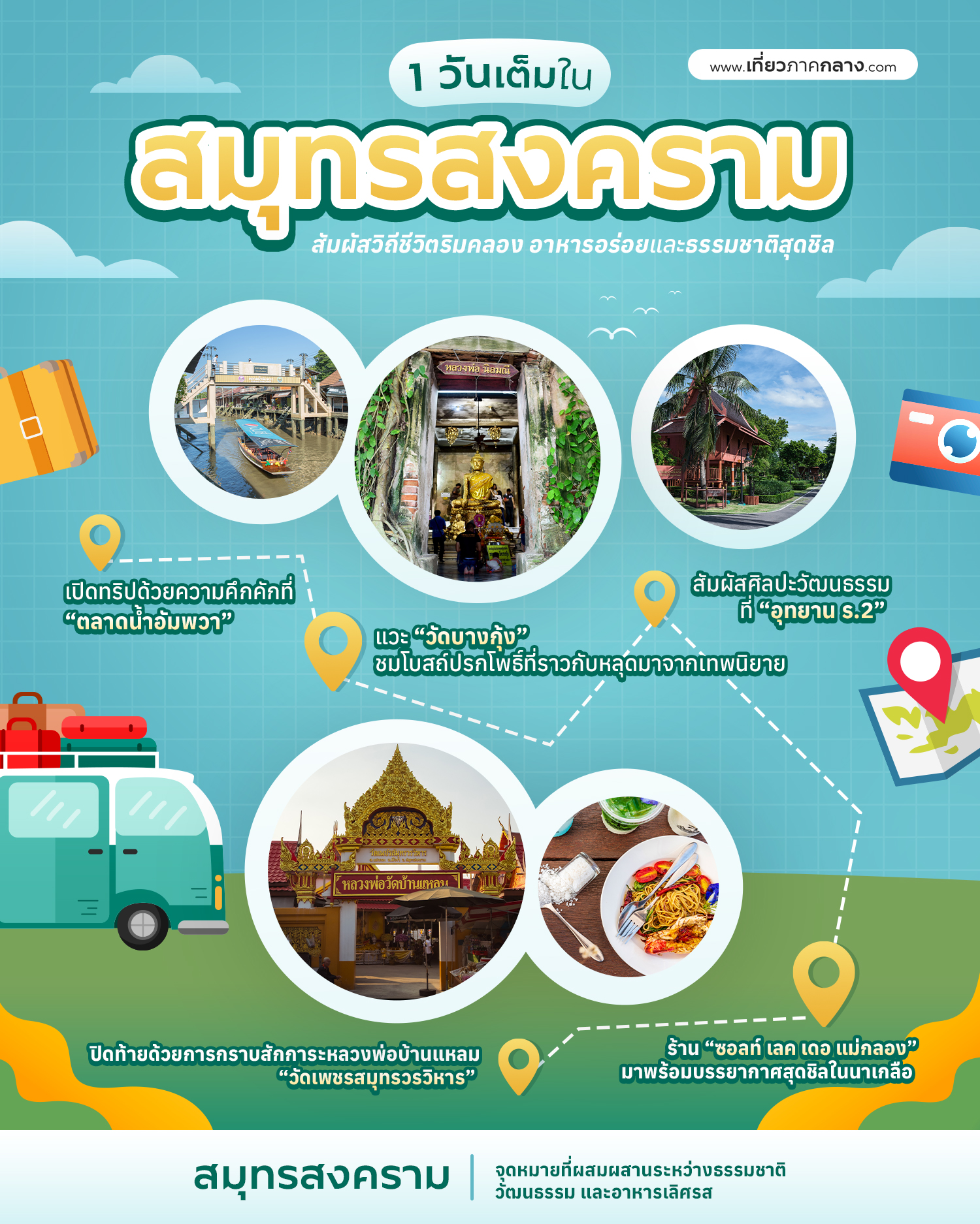 สมุทรสงคราม คือจุดหมายที่ผสมผสานระหว่างธรรมชาติ วัฒนธรรม และอาหารเลิศรส ทริป 1 วันในจังหวัดนี้จะทำให้คุณทั้งอิ่มเอมใจและประทับใจไปพร้อมๆ กัน อย่ารอช้า จัดกระเป๋าแล้วออกเดินทางไปสมุทรสงครามกันเลย!