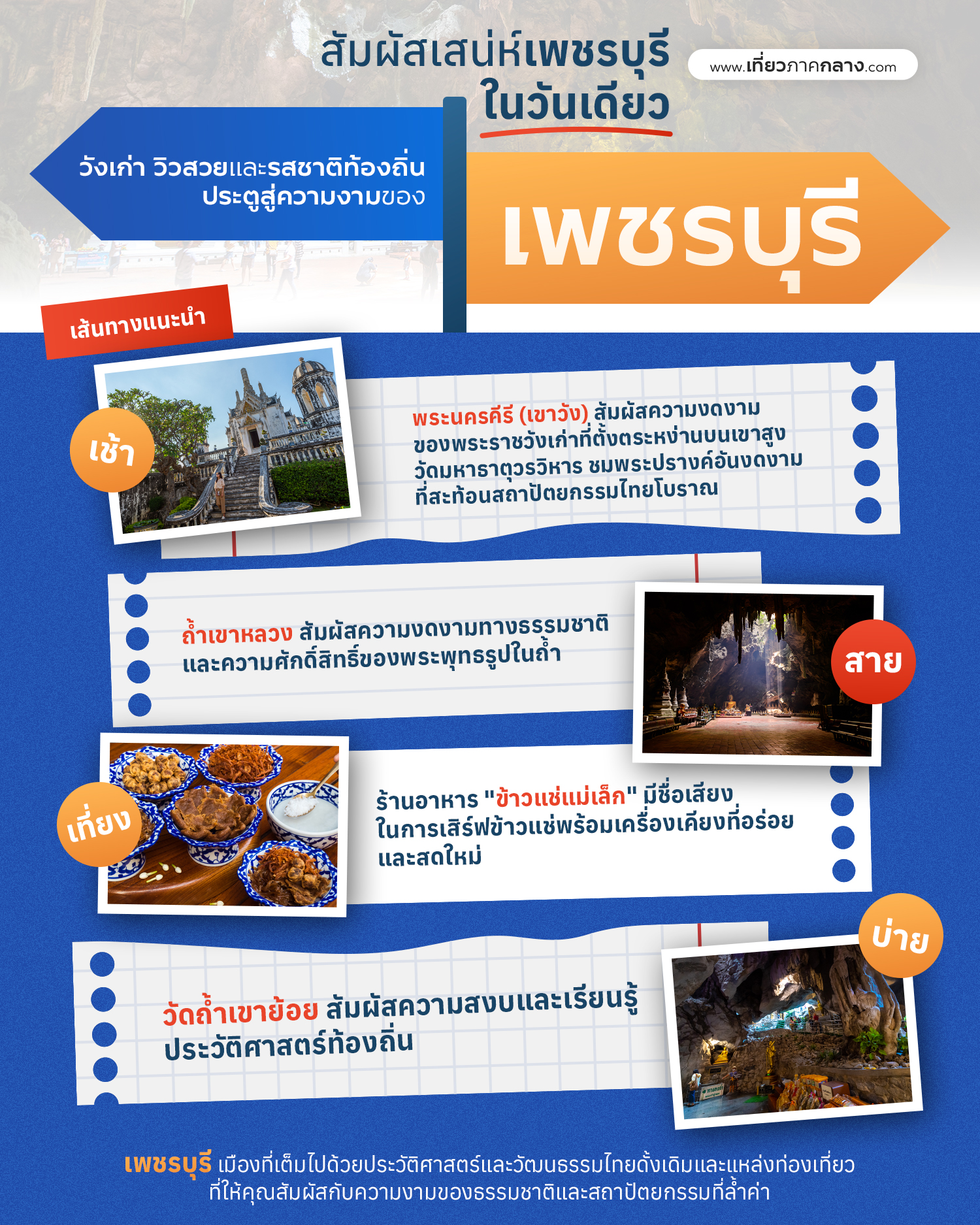 เพชรบุรี เมืองที่ไม่เพียงแต่เต็มไปด้วยประวัติศาสตร์และวัฒนธรรมไทยดั้งเดิม แต่ยังเป็นแหล่งท่องเที่ยวที่ให้คุณสัมผัสกับความงามของธรรมชาติและสถาปัตยกรรมที่ล้ำค่า จากวังเก่าบนยอดเขาถึงอาหารพื้นบ้านรสเด็ด มาเปิดประสบการณ์การท่องเที่ยวที่คุณจะไม่ลืมในวันเดียวกัน!